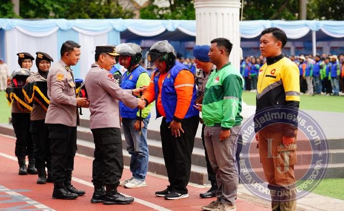 BANDUNG lintasjatimnews – Kapolri Jenderal Listyo Sigit Prabowo memimpin apel ojek online (ojol) kamtibmas ‘Sauyunan Jaga Lembur’ Polda Jawa Barat di Lapangan Upakarti, Soreang, Kabupaten Bandung, Jawa Barat (Jabar), Sabtu, 8 November 2025. Kegiatan ini merupakan sinergisitas untuk saling menjaga keamanan di lingkungan masyarakat.