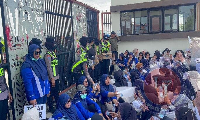 Di tengah kerumunan massa yang menyuarakan aspirasi mereka, tampak sejumlah Polisi Wanita (Polwan) dari Polres Bojonegoro Polda Jatim melakukan aksi simpatik dengan membagikan air mineral kepada para pengunjuk rasa.