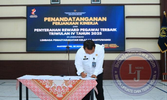BANYUWANGI lintasjatimnews – Guna memperkuat akuntabilitas dan kinerja institusi, jajaran Lembaga Pemasyarakatan (Lapas) Kelas IIA Banyuwangi melaksanakan penandatanganan Perjanjian Kinerja untuk tahun berjalan. Kegiatan yang berlangsung khidmat ini digelar di Aula Sahardjo Lapas setempat, Kamis (20/11).