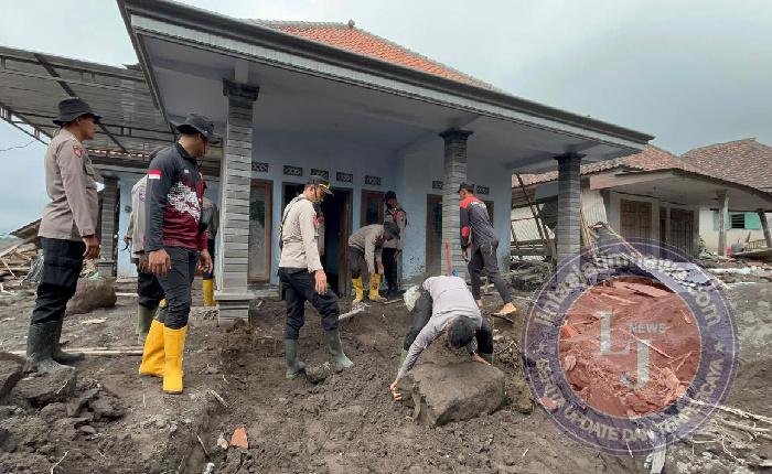 Puluhan personel gabungan dari Polda Jatim dan Polres Lumajang melakukan pembersihan rumah-rumah warga di Dusun Sumbersari, Desa Supiturang, Kecamatan Pronojiwo, Kabupaten Lumajang, Jumat (28/11/2025).