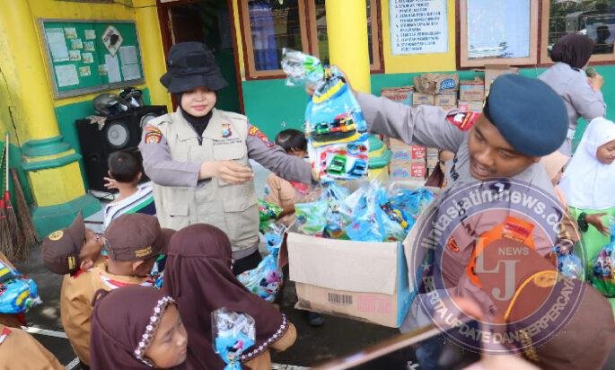 Polwan dan personel Brimob membuat suasana menjadi penuh tawa dengan kegiatan interaktif yang mengajak siswa bergerak, bernyanyi, dan bermain bersama.