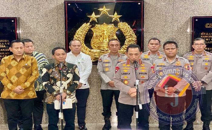 JAKARTA lintasjatimnews – Kapolri Jenderal Polisi Listyo Sigit Prabowo bersama Menteri Kehutanan Raja Juli Antoni menggelar doorstop usai audiensi di Gedung Utama Mabes Polri, Kamis malam (4/12/2025). Pertemuan tersebut membahas penanganan temuan kayu yang diduga menjadi salah satu faktor terjadinya kerusakan infrastruktur dan korban jiwa akibat bencana di Aceh, Sumatera, dan Sumatera Barat.
