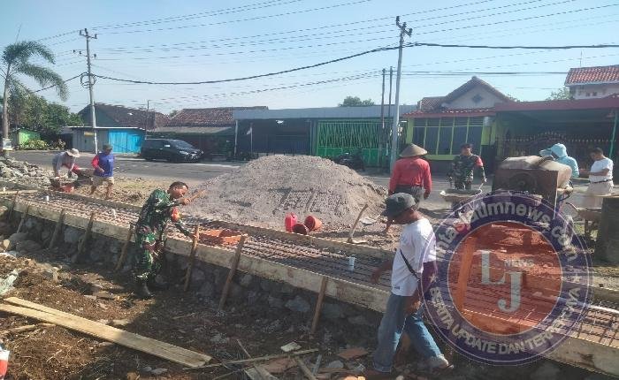 SRAGEN lintasjatimnews – Pelda R. Jumarno berserta dua Anggota Koramil 18/Kalijambe Kodim 0725/Sragen bersama warga membuat talud penahan jalan di Dusun Plosorejo RT.12 Desa Kalimacan Kecamatan Kalijambe, Senin (08/12/2025).