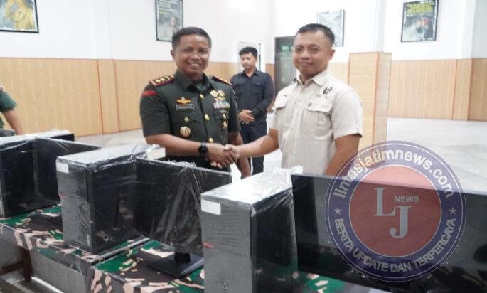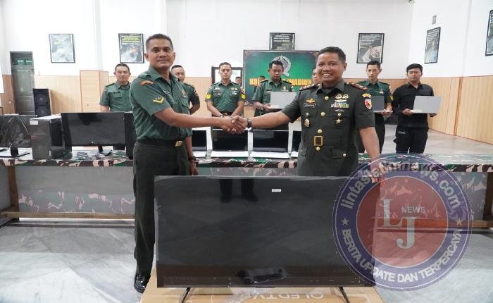 MADIUN lintasjatimnews – Komandan Kodim (Dandim) 0803/Madiun, Letkol Inf I Nyoman Adhisaputra, menyerahkan bantuan sarana pendukung berupa delapan unit laptop, empat unit komputer (PC), satu unit kamera DSLR, dan satu unit televisi berukuran 55 inci kepada staf jajaran Kodim 0803/Madiun.