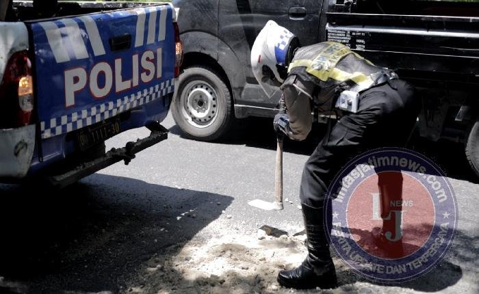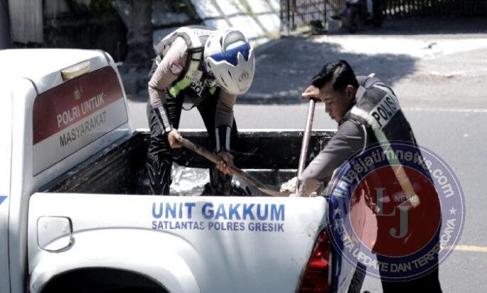 Tanpa menunggu lama, anggota Timsus Satlantas Polres Gresik secara swadaya mengupayakan material dan melakukan penambalan darurat pada titik-titik kerusakan tersebut.