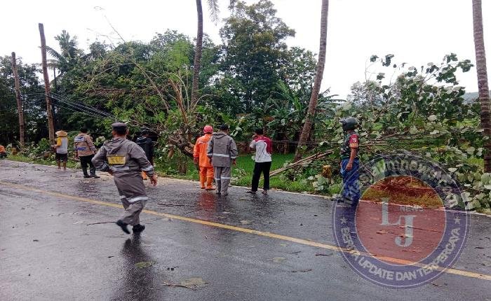 Dengan peralatan seadanya, tim gabungan bahu-membahu memotong batang dan dahan pohon waru yang melintang di jalan nasional. Koordinasi yang solid antara TNI, Polri, BPBD, dan masyarakat menjadi kunci percepatan penanganan, meskipun cuaca belum sepenuhnya bersahabat.