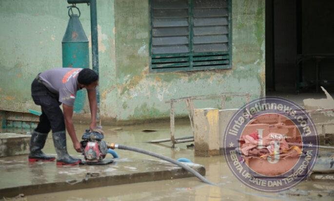 Hari ini Pasukan gabungan Korbrimob Polri dan Brimob Polda Aceh mengerahkan Personel dan peralatan yang dimiliki untuk membantu menguras air yang menggenang di Markas Komando Kompi Senapan A Yonif 111 / Karma Bakti, Aceh Tamiang.