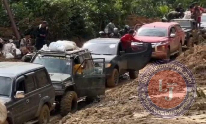 Perjalanan menuju Kecamatan Pining dihadapkan pada berbagai kendala, mulai dari jalan licin, lumpur tebal, hingga material banjir yang menutup hampir seluruh jalur. Di sejumlah titik, rombongan harus berhenti dan menunggu alat berat membuka jalan. Kapolres bersama unsur pemerintah daerah secara langsung mengawal proses pembukaan akses agar jalur dapat segera dilalui.