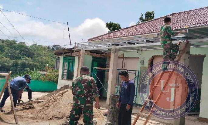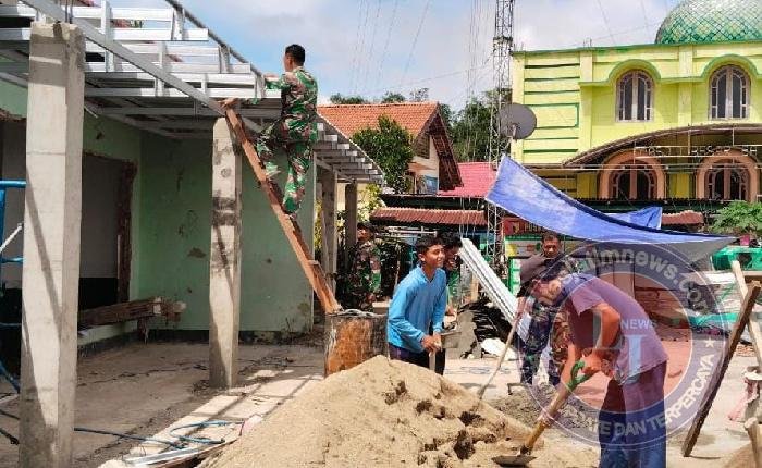 Pada kesempatan tersebut Batituud Koramil 06/Bandar Pelda Triyono yang juga tampak turun langsung memimpin jalannya pembangunan bersama kedua rekannya Babinsa masih dengan mengenakan Pakaian Dinas Lapangan (PDL), ia tak segan ikut membantu memasang atap yang terbuat dari baja ringan tersebut bersama anggota babinsa yang juga sedang mengaduk semen cor untuk tiang dan juga tembok.