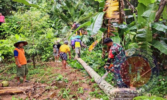 PACITAN lintasjatimnews – Personil Babinsa Koramil 0801/01 Pacitan Koptu Tri Handoko bersama Bhabinkamtibmas dan juga warga setempat melaksanakan peninjauan sekaligus membantu warga yang tertimpa musibah akibat pohon tumbang yang berlokasi di RT 02 RW 07, Dusun Bareng, Desa Sambong, Kec/Kab. Pacitan, pada Sabtu (10/01/2026).