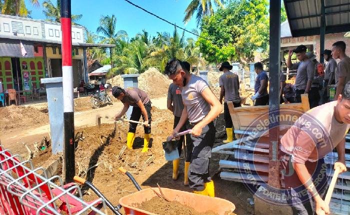 Dengan penuh semangat, personel Polri bersama warga bahu-membahu membersihkan lumpur yang mengendap di dalam ruangan pelayanan, kamar pemeriksaan, garasi, hingga area lingkungan sekitar Polindes.