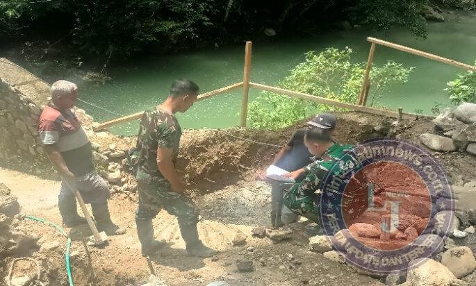 Di lokasi pembangunan jembatan, Dandim meninjau dan berkordinasi langsung dengan pekerja dan anggota Kodim yang membantu melaksanakan pekerjaan tersebut.