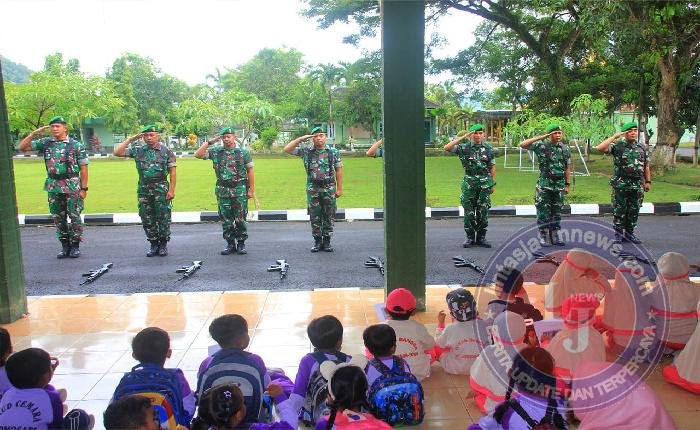 Interaksi hangat terjalin antara para prajurit dan peserta didik. Anak-anak tampak menyimak dengan penuh perhatian saat dijelaskan tentang nilai-nilai kebangsaan, cinta tanah air, serta peran TNI dalam menjaga kedaulatan Negara Kesatuan Republik Indonesia.