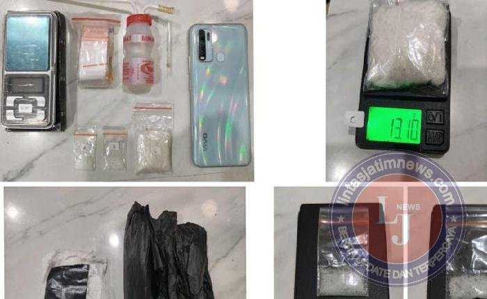 Saat dilakukan penggeledahan di rumah tersangka, petugas kembali menemukan barang bukti berupa satu klip plastik bening berisi sabu, satu unit timbangan digital, satu set alat hisap sabu, satu pak plastik klip bening, satu kantong plastik warna hitam, serta satu lembar kertas tisu yang dibungkus lakban hitam. Total barang bukti narkotika jenis sabu yang diamankan seberat 14,32 gram.