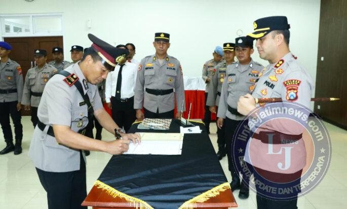 Prosesi sertijab ditandai dengan pengambilan sumpah jabatan serta penandatanganan berita acara oleh pejabat baru di hadapan Kapolres Gresik.