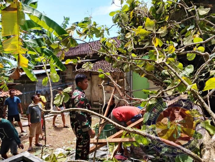 “Kami mendatangi TKP untuk membantu meninyingkirkan pohon tumbang yang menimpa rumah bapak Suparwanto tersebut dengan bergotong royong, “kata Babinsa.