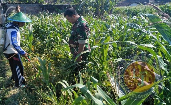 “ Salah satu kegiatan yang kami lakukan hari ini yaitu melakukan pendampingan penyemprotan hama tanaman jagung di lahan seluas 1,5 hektar milik Bapak Supardi yang tergabung dalam kelompok tani (Poktan) Anyuburi Kelurahan Mangunsuman Kecamatan Siman, “ ujar Sertu Sudarwanto.