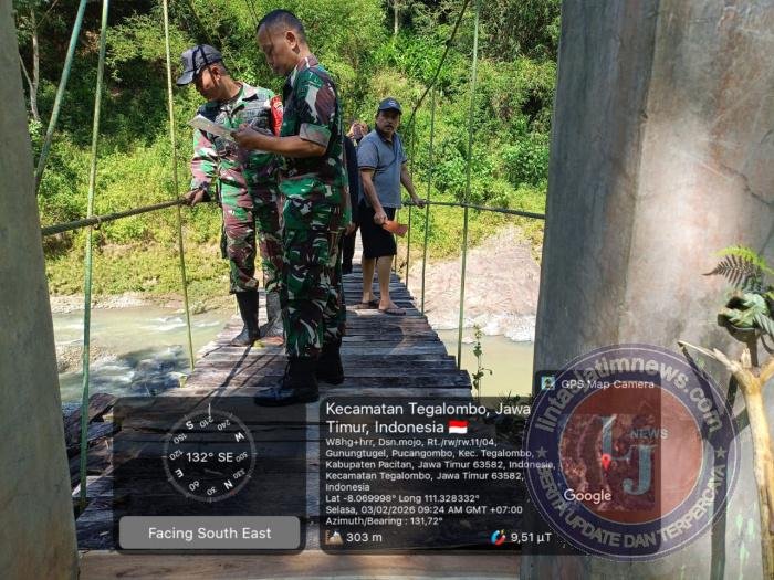 PACITAN lintasjatimnews.com – Babinsa Koramil 04/Tegalombo, Kodim 0801/Pacitan Koptu Destiko mendampingi Tim dari Denzibang 3/V Madiun dalam pengecekan dan pengukuran rencana pembangunan jembatan gantung di Desa Pucangombo, Kecamatan Tegalombo, Kabupaten Pacitan. Selasa (3/2/2026).
