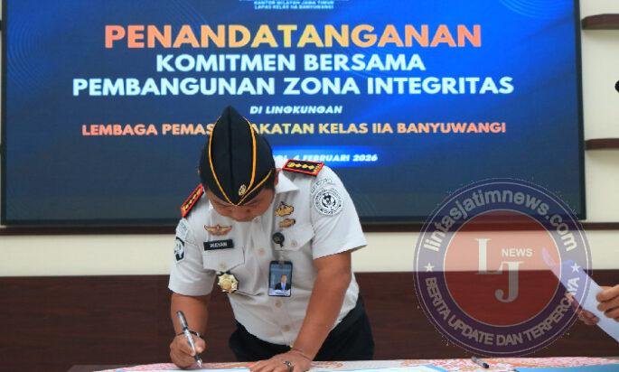 BANYUWANGI lintasjatimnews – Lembaga Pemasyarakatan (Lapas) Kelas IIA Banyuwangi resmi memulai langkah besar dalam memperkuat tata kelola pemerintahan yang bersih. Bertempat di Aula Sahardjo, jajaran Lapas Banyuwangi menggelar Deklarasi Pembangunan Zona Integritas (ZI) yang ditandai dengan penandatanganan komitmen bersama menuju Wilayah Birokrasi Bersih dan Melayani (WBBM), Rabu (04/02).