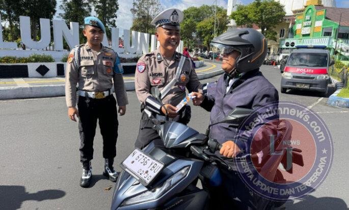 Petugas menyapa satu per satu pengguna jalan, baik pengendara roda dua maupun roda empat, sembari memberikan edukasi tentang pentingnya tertib berlalu lintas.