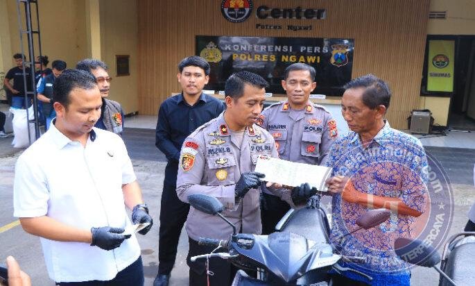 Setelah berhasil mengamankan tersangka dan menemukan kendaraan yang dilaporkan hilang, Wakapolres Ngawi Kompol Rizki Santoso, S.I.K yang didampingi Kasatreskrim Polres Ngawi AKP Aris Gunadi, S.H secara resmi menyerahkan barang bukti kepada para pemiliknya.
