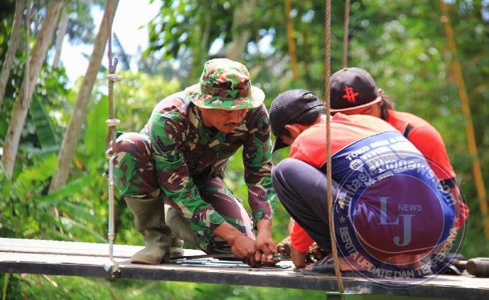 Suasana gotong royong tampak kental di lokasi pembangunan. Prajurit TNI bersama warga bahu-membahu menyelesaikan pekerjaan yang tersisa, mulai dari penyesuaian struktur hingga penguatan bagian penopang jembatan. Kolaborasi ini mencerminkan kemanunggalan TNI dan rakyat yang terus terjaga dalam berbagai program pembangunan di wilayah pedesaan.