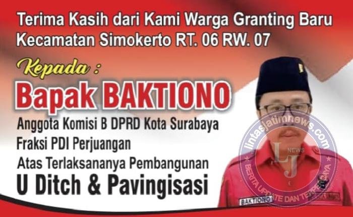 Sekali lagi saya atas nama ketua RT 06 kampung Granting baru Arif Wibowo dan RW 07 ibu Yayuk Indayana mengucapkan ribuan terimakasih kepada Bapak Baktiono dan Pemerintah Kota Surabaya atas terlaksananya pembangunan jalan dan pembuangan saluran air di kampung kami