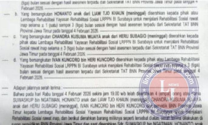SURABAYA lintasjatimnews – Integritas Badan Narkotika Nasional Provinsi (BNNP) kini tengah berada di bawah sorotan tajam. Dugaan adanya “permainan” dalam penempatan residen rehabilitasi mencuat setelah munculnya dualisme surat penunjukan terhadap empat tersangka penyalahgunaan narkotika, yang salah satunya diketahui merupakan anak dari pemilik jaringan bisnis hiburan ternama, Rasa Sayang Group.