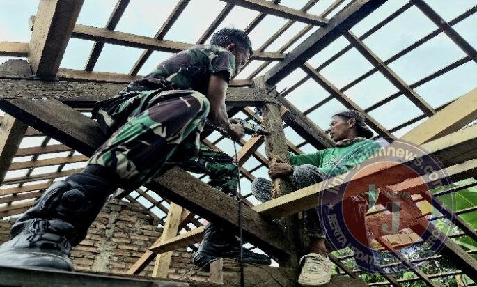 PACITAN lintasjatimnews – Kepdulian TNI terhadap warga masyarakat tertuang dalam kegiatan yang di lakukan para anggota Koramil 0801/01 Pacitan Pelda Dwi Santoso selaku Batituud Ramil 0801/01 Pacitan dan beberapa anggota babinsa lainya bersama tim relawan dan warga masyarakat melaksanakan karya bakti perbaikan rumah bapak Sugito, yang terletak di Desa Menadi, Kec./Kab. Pacitan akibat di landa gempa bumi yang terjadi sepekan lalu.