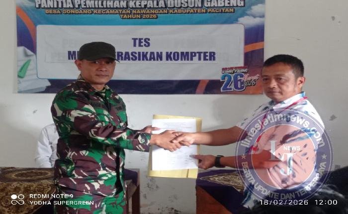 PACITAN lintasjatimnews – Dorong perkembangan era digital, Danramil 0801/05 Nawangan Kapten Inf Agus nuriadi menghadiri ujian kompetensi pelaksanaan dan seleksi penjaringan ujian praktek komputer calon perangkat Desa Gondang, bertempat di balai Desa Gondang, Kecamatan Nawangan, Kabupaten Pacitan. Rabu (18/2/2026).