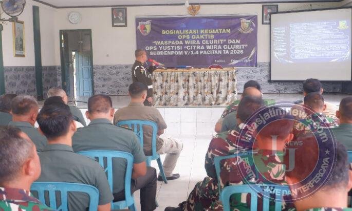 PACITAN lintasjatimnews – Dalam upaya meningkatkan disiplin dan kepatuhan hukum prajurit, Kodim 0801/Pacitan bersama Subdenpom V/1-4 Pacitan menyelenggarakan sosialisasi kegiatan Operasi Penegakan Ketertiban (Ops Gaktib) bertajuk “Waspada Wira Clurit” serta Operasi Yustisi. Kegiatan tersebut digelar di aula Kopral Sigit Makodim 0801/Pacitan dan diikuti oleh seluruh anggota militer maupun PNS di lingkungan Kodim serta anggota Subdenpom V/1-4 Pacitan, Kamis (19/2/2026).