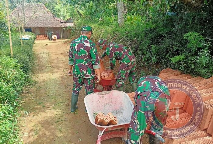 Material genteng mulai didatangkan ke lokasi, dan proses bongkar muat dilakukan secara gotong royong oleh personel Satgas TMMD bersama masyarakat menggunakan angkong.