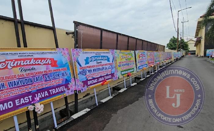 PROBOLINGGO lintasjatimnews – Puluhan karangan bunga memenuhi halaman Polres Probolinggo Polda Jawa Timur pasca tertangkapnya komplotan pencuri koper milik wisatawan asal Thailand di kawasan wisata Gunung Bromo.