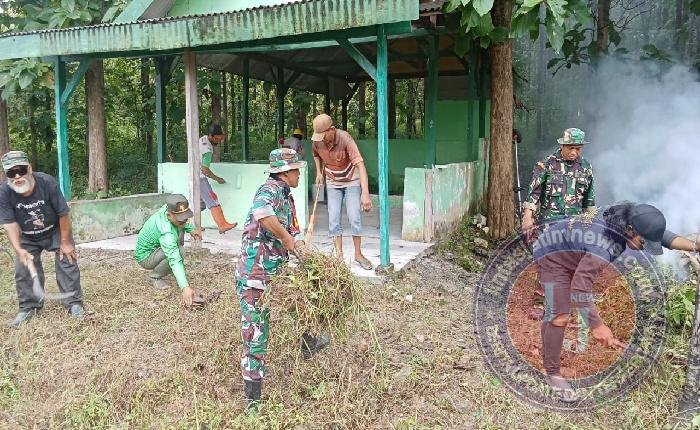 GRESIK lintasjatimnews – Penggalangan sinergitas aparatur pemerintah, Koramil 14/ Panceng bersama masyarakat pengguna warung di sepanjang jalan raya Daendels dalam giat kerja bakti membersihkan Pos, saluran air, sampah dan semak belukar yang tumbuh liar di kawasan pinggiran hutan Kecamatan Panceng Kabupaten Gresik (27/02/26).
