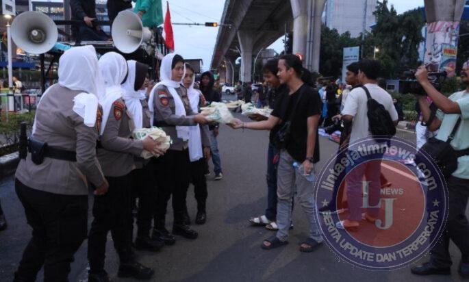 JAKARTA lintasjatimnews.com – Pemandangan berbeda terlihat dalam pengamanan penyampaian aspirasi oleh kelompok mahasiswa di depan Mabes Polri, Jumat (27/2). Memasuki bulan suci Ramadhan, Polda Metro Jaya menerapkan pola pengamanan progresif yang jauh dari kesan kaku. Alih-alih barikade yang intimidatif, para personel yang bertugas justru tampil religius dengan mengenakan peci dan syal bagi polisi laki-laki, serta jilbab bagi Polwan, sebagai bentuk penghormatan terhadap kekhidmatan bulan puasa.