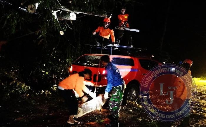 TRENGGALEK lintasjatimnews – Hujan deras yang mengguyur wilayah Kecamatan Tugu, Kabupaten Trenggalek, Jawa Timur, pada Sabtu (7/3/2026) malam memicu tumbangnya sebuah pohon sengon berukuran besar yang menutup total jalur nasional Trenggalek–Ponorogo. Peristiwa tersebut terjadi di Desa Nglinggis, Kecamatan Tugu, sehingga arus lalu lintas di jalur penghubung dua kabupaten itu sempat lumpuh selama proses penanganan.