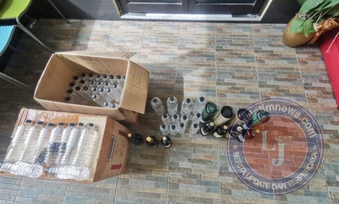 Selain itu Polisi juga menyita berbagai jenis minuman beralkohol, mulai dari produk impor hingga puluhan botol arak Bali yang dikemas dalam botol air mineral.