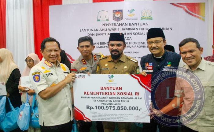 ACEH TIMUR lintasjatimnews – Menteri Dalam Negeri (Mendagri) sekaligus Ketua Satuan Tugas (Kasatgas) Percepatan Rehabilitasi dan Rekonstruksi (PRR) Pascabencana Sumatera Muhammad Tito Karnavian bersama Menteri Sosial (Mensos) Saifullah Yusuf menyerahkan bantuan sosial (bansos) bagi korban bencana di Provinsi Aceh, Sumatera Utara (Sumut), dan Sumatera Barat (Sumbar). Seremoni penyerahan bantuan berlangsung secara hybrid dari Pendopo Bupati Aceh Timur, Aceh, Senin (16/3/2026).
