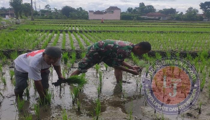 Salah satunya dilakukan Serda Edi Nursid anggota Koramil Tipe B 0802/04 Siman, Kodim 0802/Ponorogo yang bertugas menjadi Babinsa Desa Manuk Kecamatan Siman Kabupaten Ponorogo hari ini turut membantu petani di wilayah desa binaan yang sedang melakukan penyulaman tanaman padi di lahan seluas 1,5 kotak.