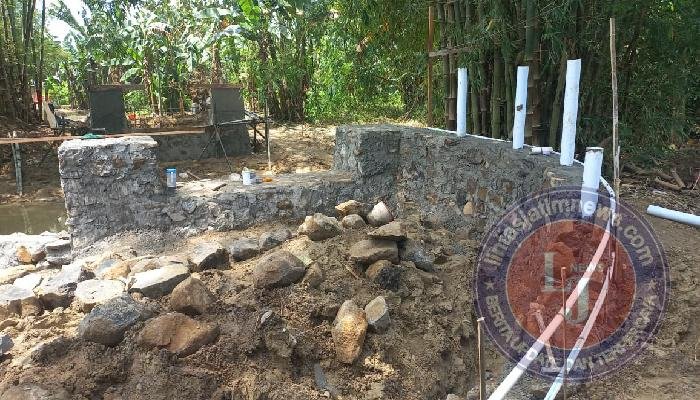 Struktur dinding penahan mulai terbentuk dengan susunan batu yang diperkuat adukan semen, menandakan konstruksi berjalan sesuai rencana. Selain itu, pemasangan pipa pendukung di sisi bangunan juga mulai dilakukan sebagai bagian dari sistem pendukung jembatan. Tahapan ini sangat penting guna memastikan jembatan memiliki daya tahan yang kuat dan mampu digunakan dalam jangka panjang.