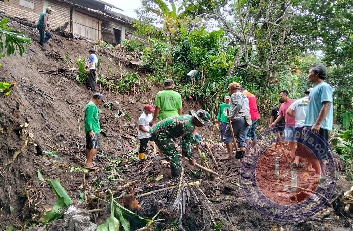 Kerja bakti ini melibatkan personel Koramil, warga sekitar, serta unsur terkait lainnya. Dengan menggunakan peralatan sederhana seperti cangkul, sekop, dan alat seadanya, mereka bergotong royong membersihkan material longsoran secara bertahap.