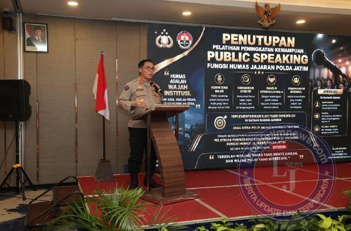 SIDOARJO lintasjatimnews – Kepala Bidang Hubungan Masyarakat (Kabid Humas)Polda Jawa Timur, Kombes Pol Jules Abraham Abast resmi menutup kegiatan Pelatihan Peningkatan Kemampuan Public Speaking Fungsi Humas Jajaran Polda Jatim Tahun Anggaran 2026 yang digelar di Sidoarjo, Rabu (29/4/2026).