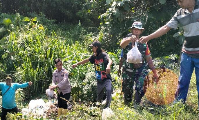 Peringatan Hari Peduli Sampah Nasional (HPSN) Tiga Pilar, TNI POLRI PERHUTANI gelar giat gotong royong membersihkan sampah dan pemasangan plang himbauan “Buanglah sampah pada tempatnya”