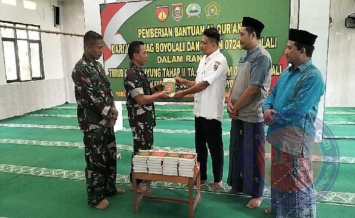 BOYOLALI lintasjatimnews – Tingkatkan ke Imanan dan Ketaqwaan serta minat baca Al Quran kepada masyarakat, anggota Satgas TMMD sengkuyung tahap II Kodim 0724/Boyolali TA 2025 bagikan puluhan Al-Quran ke masjid Baitul Rohman Desa Kayen Kecamatan Juwangi Kabupaten Boyolali. Jumat ( 09/05/25)