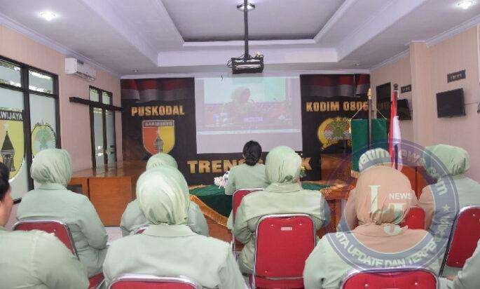 Ketua Persit KCK Cabang XX Dim 0806 Trenggalek Ny. Jeane Peddy, beserta pengurus ikuti Pertemuan Gabungan Ketua Umum Persit Kartika Chandra Kirana dengan Anggota Persit Kartika Chandra Kirana Seluruh Indonesia Dalam Rangka Penekanan Hasil Musyawarah Pusat XIII Tahun 2023 melalui platform Zoom Meeting yang dilaksanakan di Aula Rapat Makodim 0806/Trenggalek, Selasa (12/9/2023).